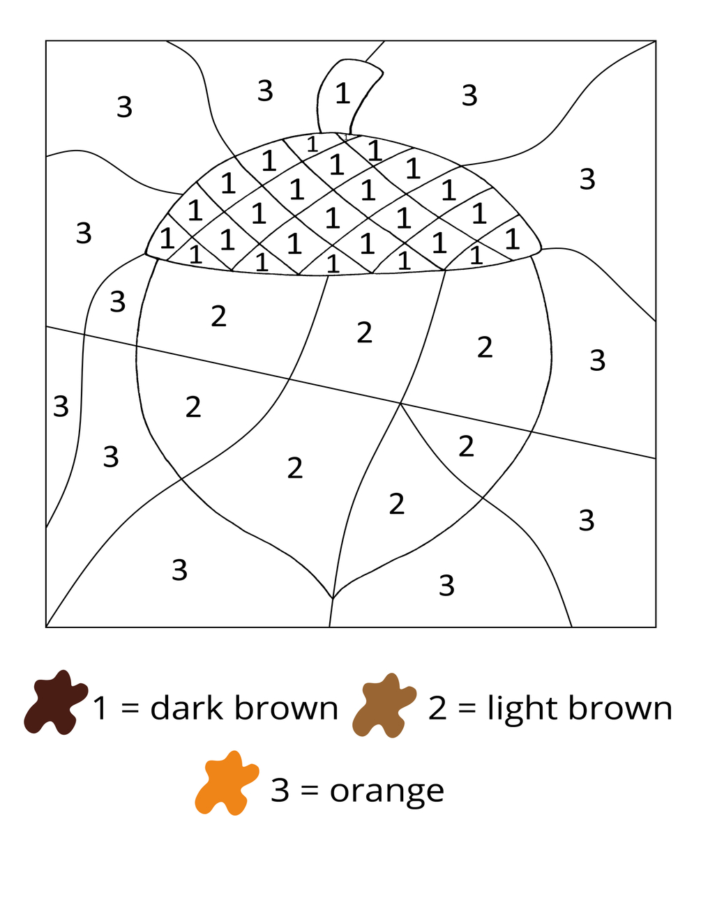 - color by code pages: acorn color by number page, apple color by number page, turkey color by number page, grapes color by letter page (lowercase letters), leaf color by letter page (uppercase letters), pie color by word page, cooked turkey color by word page